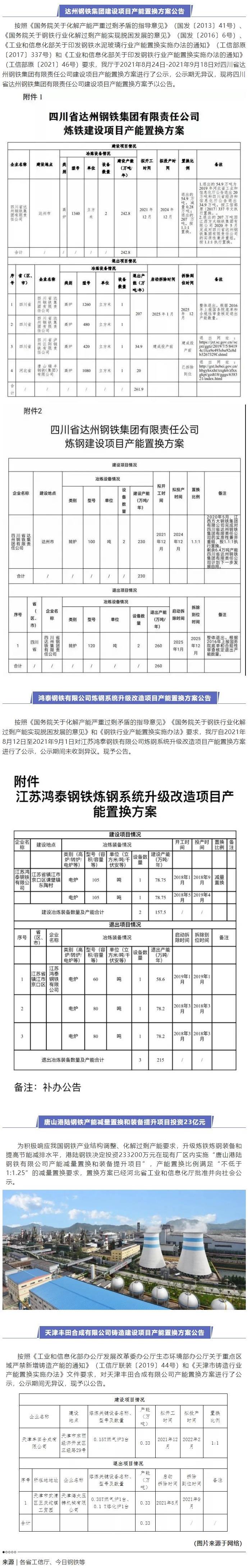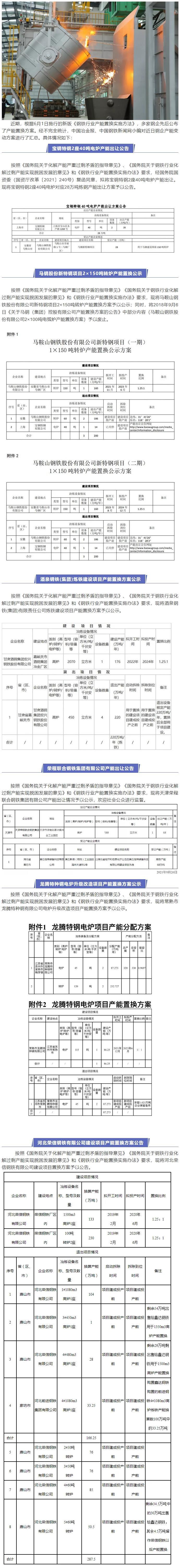 近期,根据6月1日施行的新版《钢铁行业产能置换实施方法》,多家钢企先后公布了产能置换方案。