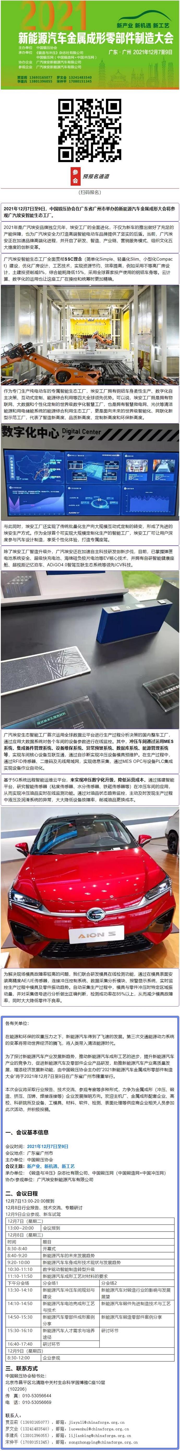 2021年12月7日至9日, 在广东省广州市举办的新能源汽车金属成形大会将参观广汽埃安智能生态工厂。