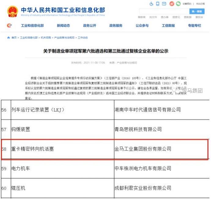 近日,工业和信息化部公示了第六批制造业单项冠军名单,金马工业集团凭借产品重卡精密转向机活塞成功入榜。这是继本年度获得“国家质量标杆”、“国家专精特新小巨人”后的又一项国家级荣誉。