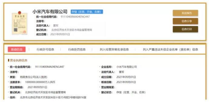 今年9月1日,国家企业信用信息公示系统登记信息便曾宣告,小米汽车有限公司在北京经济技术开发区市场监督管理局完成工商注册,登记住所为北京市北京经济技术开发区科创十街15号院5号楼8层816室。但彼时随之传出的是,小米汽车将收购北京现代工厂、江淮工厂以加速生产,很显然,这一猜测伴随今天这一消息被证伪。