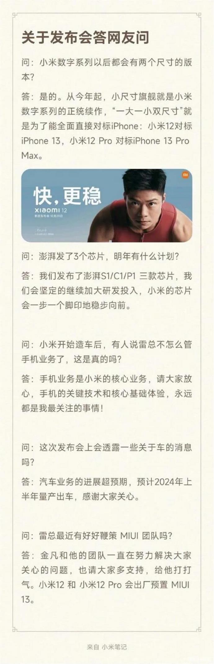 12月24日,在距离小米12发布仅剩4天时间之际,雷军在微博上发布了一则《关于发布会答网友问》。其中关于汽车业务方面,雷军再次表示,小米汽车业务的进展超预期,预计2024年上半年量产出车。