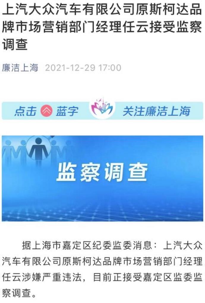 据“廉洁上海”12月29日发布消息,上汽大众汽车有限公司原斯柯达品牌市场营销部门经理任云涉嫌严重违法,目前正接受嘉定区监委监察调查。这已是三个月内上汽斯柯达第二起高管涉嫌违法被查事件。