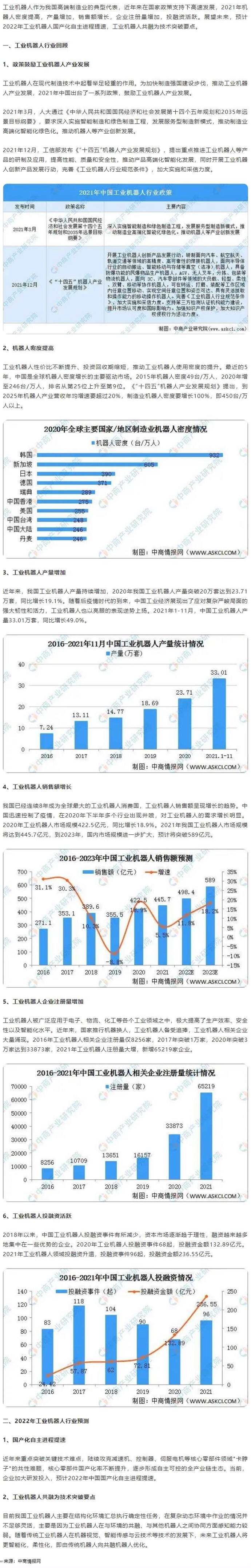 工业机器人作为我国高端制造业的典型代表,近年来在国家政策支持下高速发展,2021年机器人密度提高,产量增加,销售额增长,企业注册量增加,投融资活跃。展望未来,预计2022年工业机器人国产化自主进程提速,工业机器人共融为技术突破要点。