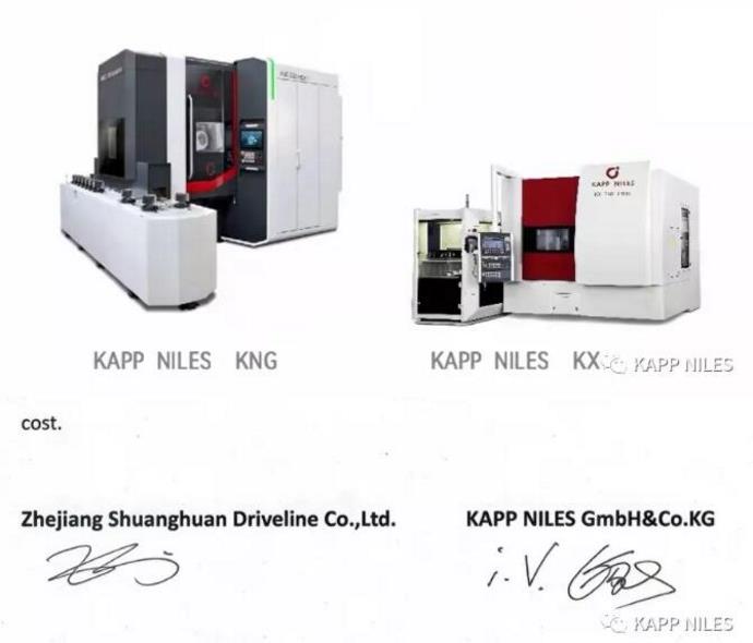 浙江双环传动机械股份有限公司董事长吴长鸿,KAPP NILES GmbH&Co.KG远东总协调、卡帕耐尔斯卡帕亚洲科技(嘉善)有限公司董事长Georg Feng (冯国)共同见证签约。出席签约仪式的领导:双环传动总经理MIN ZHANG(张民),双环(嘉兴)总经理李胜,双环传动董事长秘书黄伟,卡帕耐尔斯卡帕亚洲副总经理郭旭东,CBN车间主任沈建华。