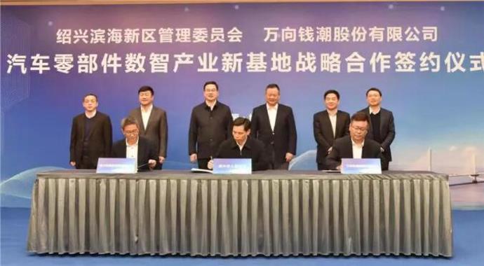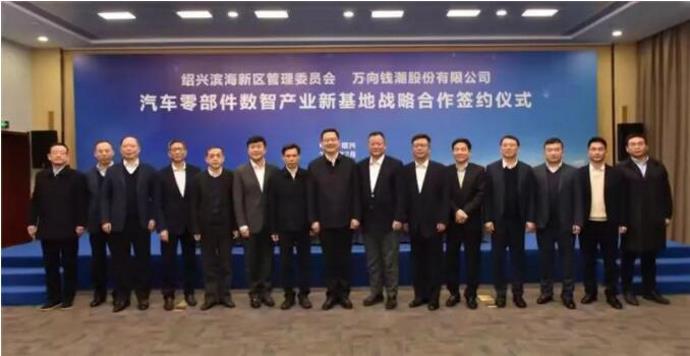 2月14日下午,绍兴滨海新区管委会与万向钱潮股份有限公司汽车零部件数智产业新基地战略合作签约仪式在市行政中心举行。
