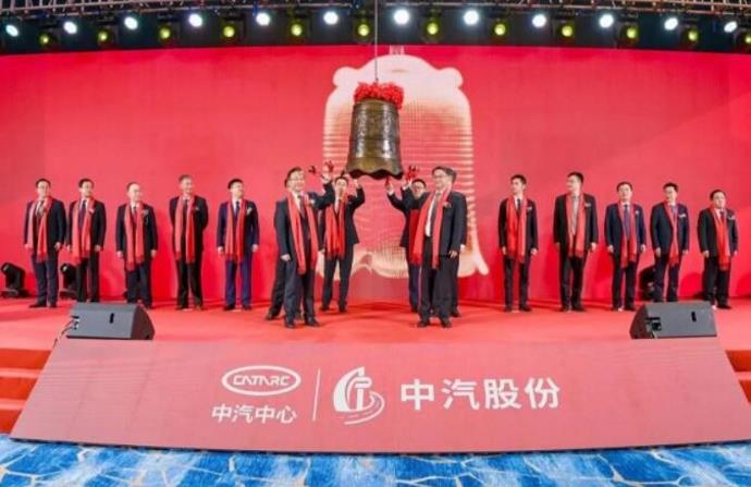 深交所首席风控官张兆义视频致辞。9点25分,中国汽车技术研究中心有限公司党委书记、董事长、总经理安铁成,盐城市委副书记、市长周斌,中国银河证券股份有限公司副总裁吴国舫,盐城市委常委、常务副市长勾凤诚,大丰区委副书记、区长戴勇,中汽股份董事、总经理欧阳涛,共同敲响“中汽股份”上市宝钟!