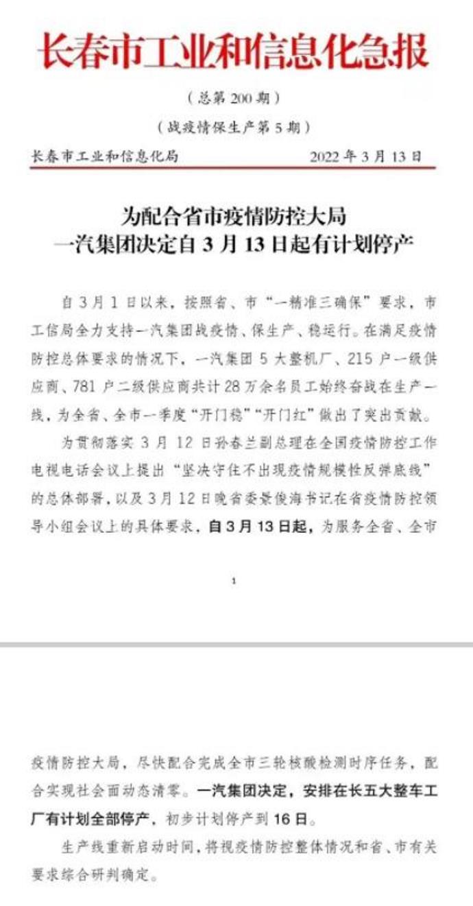 日前,长春市工业和信息化局发布《为配合省市疫情防控大局,一汽集团决定自3月13日起有计划停产》文件。