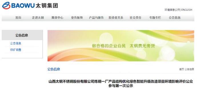 来自太钢集团官网消息,山西太钢不锈钢股份有限公司炼钢一厂产品结构优化绿色智能升级改造项目环境影响评价公示。