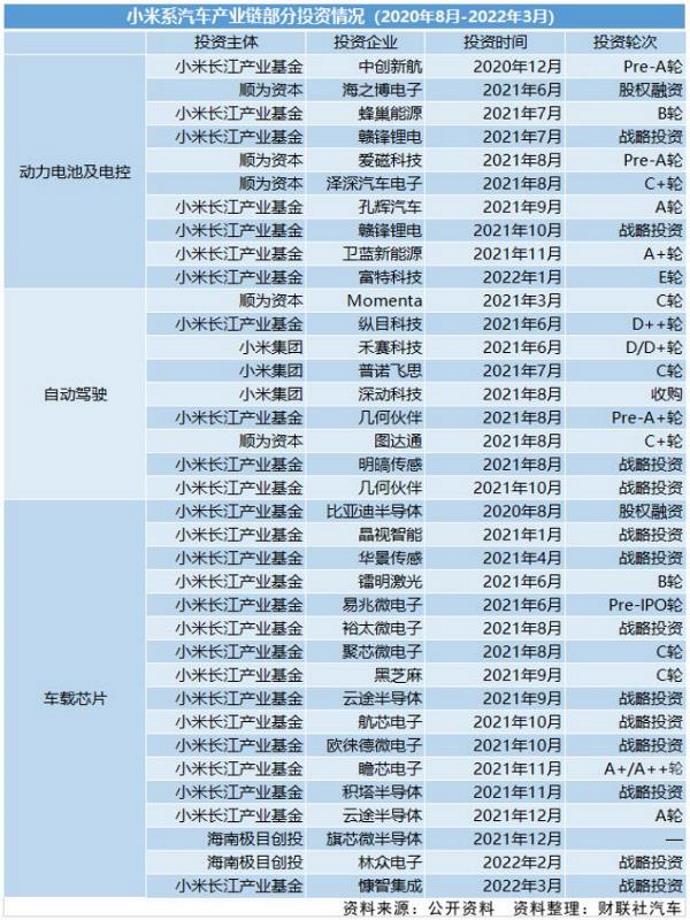 不过,比小米汽车落户亦庄,甚至比一年前雷军哽咽着宣布小米进入造车业更早的,是小米在过去一年多内在汽车领域持续的高强度投资。