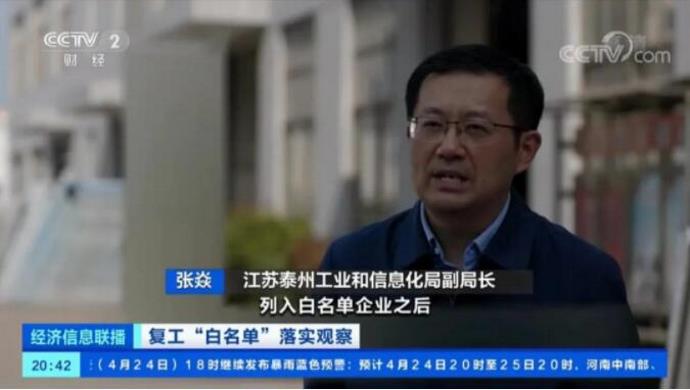 江苏泰州工业和信息化局副局长 张焱:因为前期物流受阻,大多数企业的原料进不来,然后产品出不去,列入白名单企业之后,我们会帮他们协调通行证,保证他们的生产原料顺利地进入产区,生产的产品及时发往全国各地,特别是发往上海等疫情相对敏感地区或者风险地区。