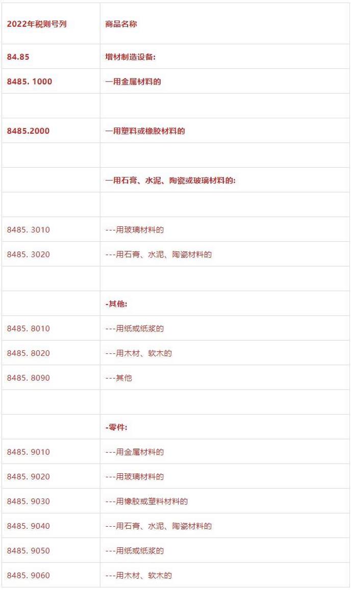 注释:品目84.85所称“增材制造”(也称3D打印)指以数字模型为基础,将介质材料(例如,金属、塑料或陶瓷)通过连续添加、堆叠、凝结和固化形成物体。