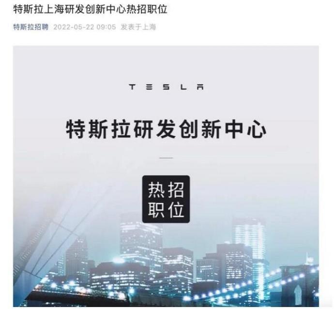 5月22日,“特斯拉招聘”微信号发布招聘研发人员的消息,涵盖车辆软件、硬件设计工程、动力&能源工程、车辆工程等多个领域100余个岗位,工作地点主要在上海临港。