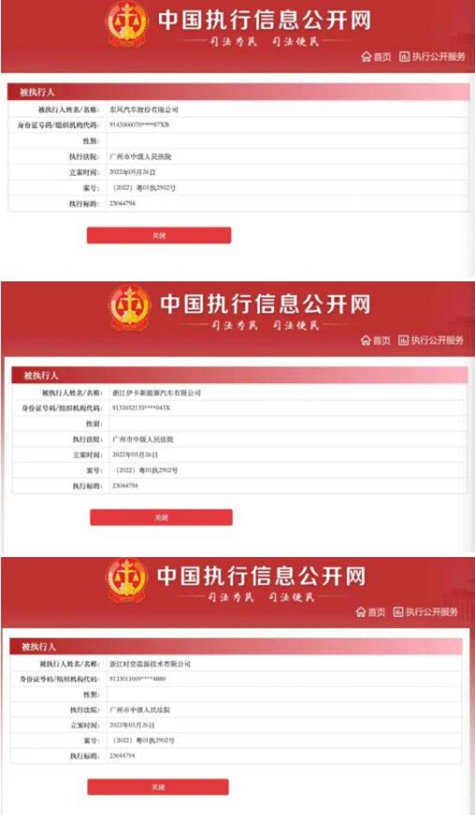 公开信息显示,2022年5月26日,东风汽车股份有限公司、浙江伊卡新能源汽车有限公司和浙江时空能源技术有限公司被广州市中级人民法院强制执行23044794元,案号为(2022)粤01执2902号。