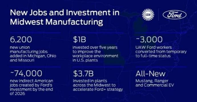 6月2日,福特宣布将在密歇根州、俄亥俄州和密苏里州投资37亿美元,新增6,200多个工会制造岗位,并将近3,000名全美汽车工人联合会-福特(UAW-Ford)临时员工转为永久全职员工,并在就业第一天为所有小时工提供医疗福利。