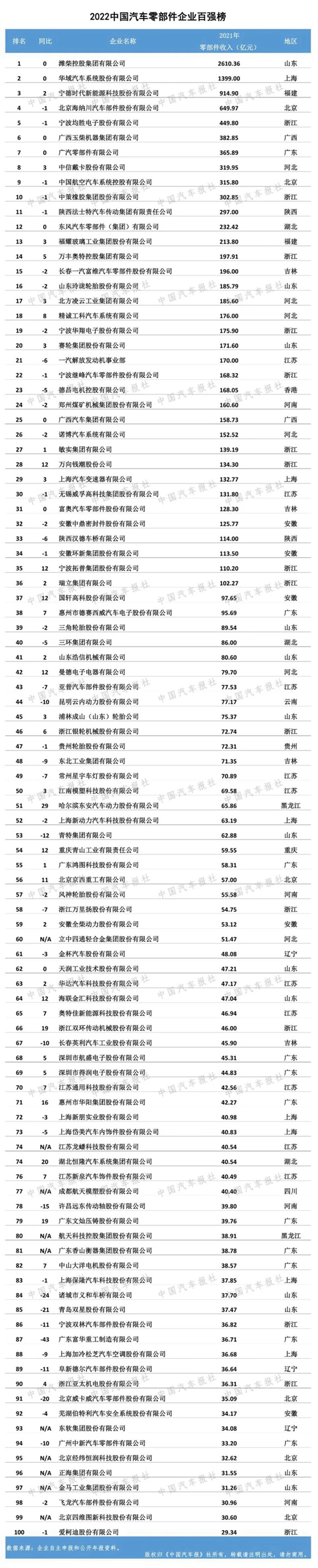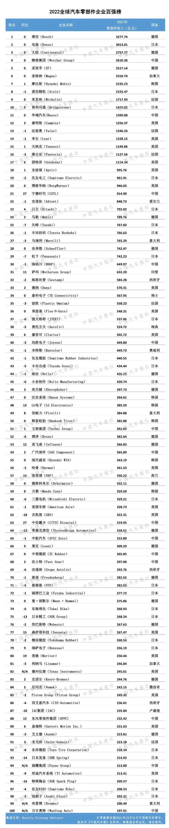 日前,中国汽车报发布《2022中国汽车零部件企业百强榜》及《2022全球汽车零部件企业百强榜。
