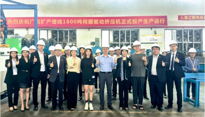2022年11月23日上午,广铝隆重举行17#机台开机仪式庆典。经过前期的安装测试,1800吨伺服驱动挤压机正式投产运行。广铝集团董事长叶鹏智、监事长唐倩萍、董事叶蕴芊、董事叶昊楠、铝系统执行董事董小雷、铝系统营销总经理李钡、铝系统总工程师刘煌萍等出席本次开机仪式。
