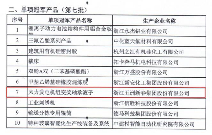 近日,工信部、中国工业经济联合会组织开展了第七批制造业单项冠军企业(产品)培育遴选和第一批、第四批制造业单项冠军企业(产品)复核工作,并已完成相关审核。其中,五洲新春的风力发电机组变桨轴承滚子名列其中。