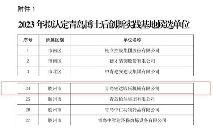 7月27日,青岛市人力资源和社会保障局对2023年“青岛市博士后站(基地)和青岛市专家工作站拟认定单位”进行了公示,公示期3个工作日。青岛宏达锻压机械有限公司正式认定为--青岛博士后创新实践基地。