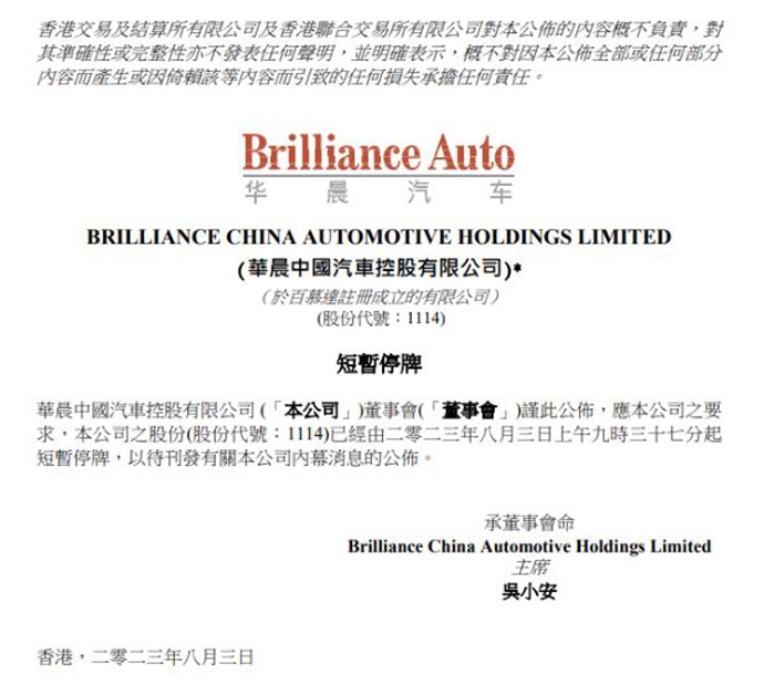 公告显示,公司收到华晨集团及沈阳市汽车工业资产经营有限公司(以下简称资产公司)出具的《告知函》,2023年8月2日,沈阳中院裁定批准《华晨汽车集团控股有限公司等12家企业实质合并重整计划》(以下简称《重整计划》)并终止华晨集团等12家企业重整程序。至此,从2020年11月持续至今的华晨系重整,终于有了“落锤”的迹象。