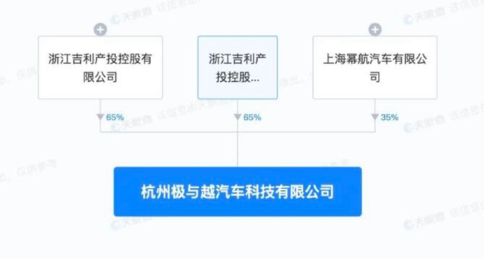 根据天眼查信息,该公司以汽车制造业为主,经营范围包含新能源汽车整车销售、汽车零配件零售、电动汽车充电基础设施运营、电池销售及二手车经纪等。股东信息显示,极与越由吉利和百度旗下幂航汽车共同持股,前者持股比重为65%,后者持股35%。