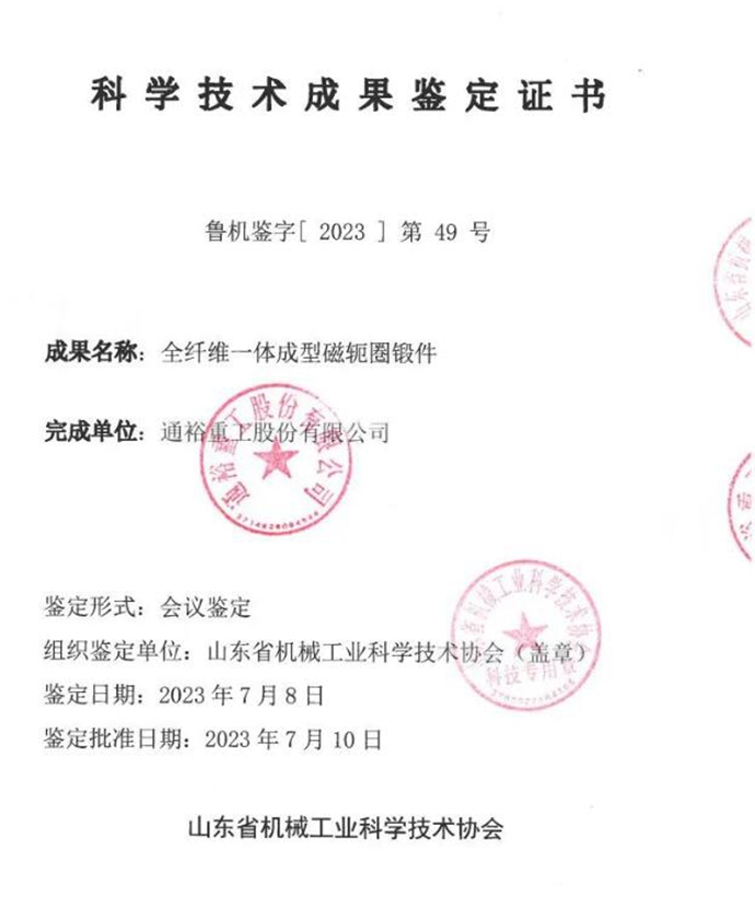 近日, 通裕重工股份有限公司委托山东省机械工业科学技术协会组织行业专家,采用线上会议的形式召开了“全纤维一体成型磁轭圏锻件”科技成果鉴定会。