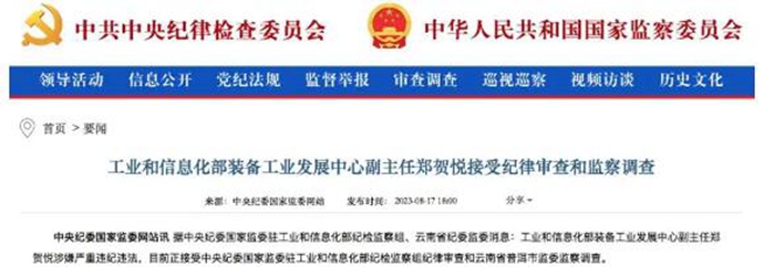 8 月 17 日,据中央纪委国家监委驻工业和信息化部纪检监察组、云南省纪委监委消息:工业和信息化部装备工业发展中心副主任郑贺悦涉嫌严重违纪违法,目前正接受中央纪委国家监委驻工业和信息化部纪检监察组纪律审查和云南省普洱市监委监察调查。