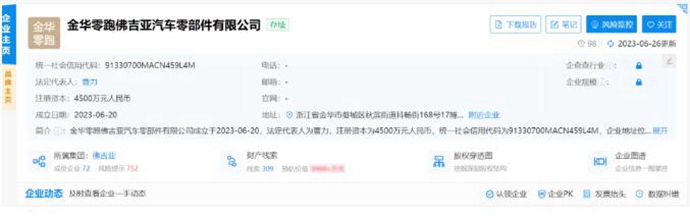 6月28日消息,据企查查显示,金华零跑佛吉亚汽车零部件有限公司于近日正式成立,法定代表人为曹力,注册资本4500万人民币,经营范围含汽车零部件及配件制造、汽车零配件零售、技术服务、货物进出口等。