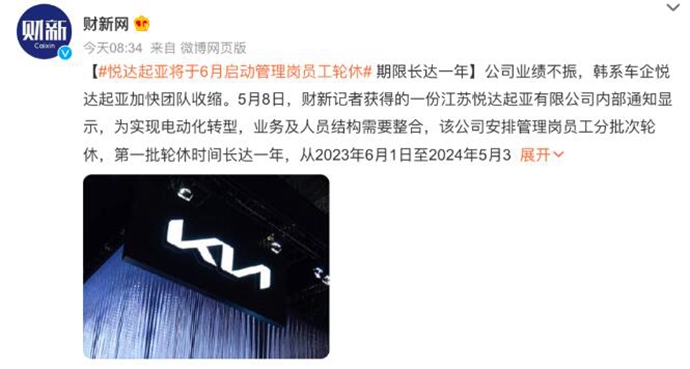 据财新网报道,江苏悦达起亚有限公司于近日发布内部通知:为实现电动化转型,业务人员结构需要整合,该公司安排管理岗员工分批次轮休,第一批轮休时间长达一年。