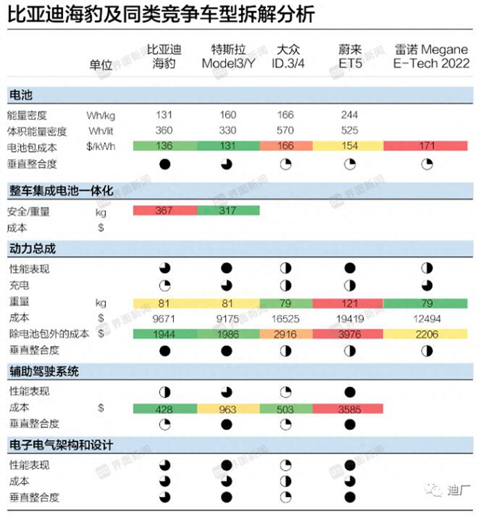据瑞银报告,比亚迪海豹中约75%的零部件是比亚迪自产,大量依赖中国的本土供应链,零部件的自产率要比特斯拉在美国生产、在中国生产或者大众在德国生产都要更高,并具有成本竞争力,总体成本相比上海生产的同级别Model 3要低15%左右,比大众汽车在欧洲生产的相似规格车型成本低35%。