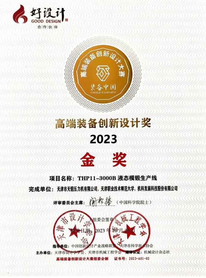 近日,2023中国工业设计工程大会在天津顺利召开。天锻公司联合天津职业技术师范大学、机科发展科技股份有限公司完成的“THP11-3000B液态模锻生产线”项目,荣获2023年高端装备创新设计大赛金奖。