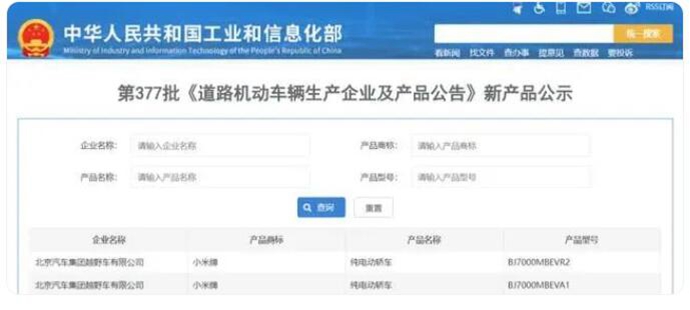 公示信息显示,小米汽车产品商标为小米牌,两款车型均为纯电动轿车,生产企业均为北京汽车集团越野车有限公司。