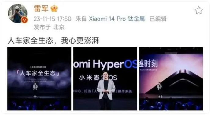在智能汽车系统方面,小米已经发布澎湃OS。雷军在10月26日的小米澎湃OS发布会上宣布,小米集团的战略已经正式升级为“人车家全生态”。他表示,以人为中心、将“人车家全生态”有机整合,承接新战略的关键是小米澎湃OS。