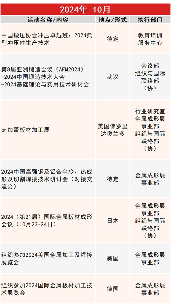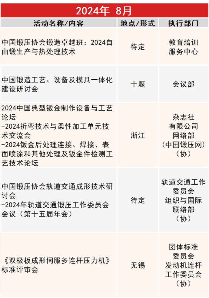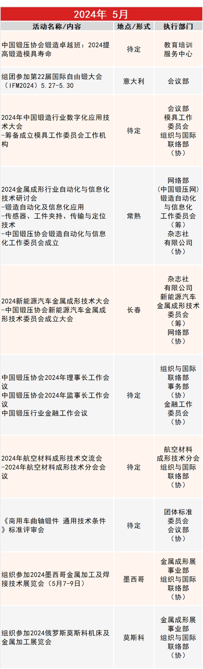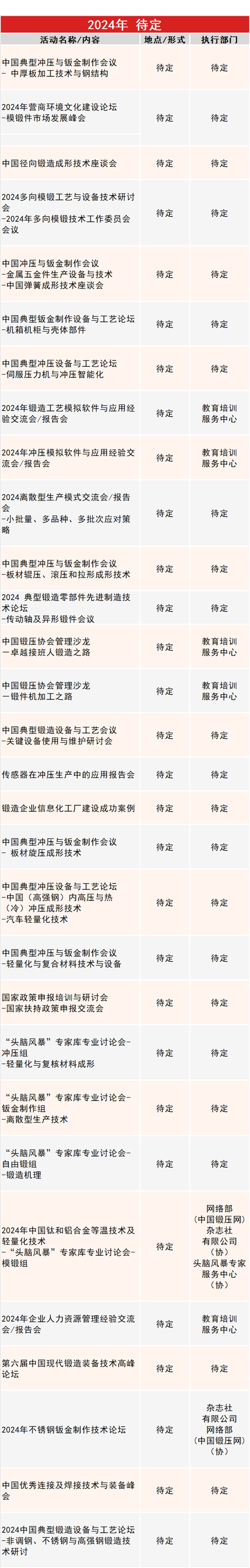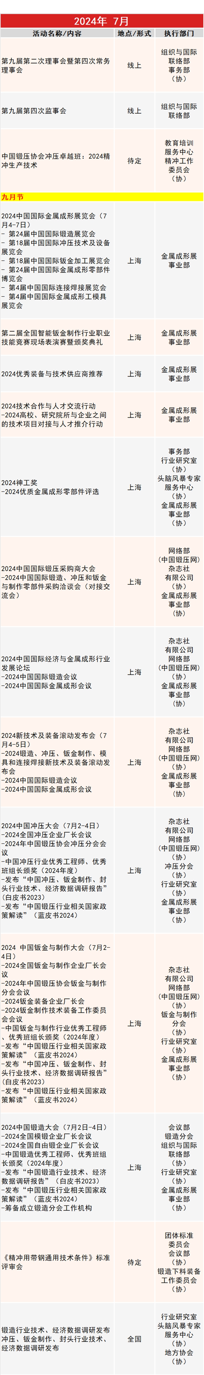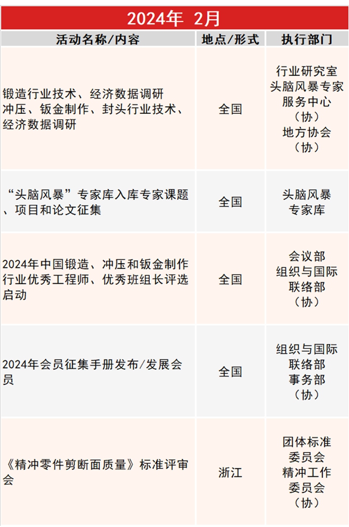 (协)=协助之意;富京公司=北京富京技术公司;杂志社有限公司=《锻造与冲压》杂志社有限公司;地方协会=与 建立了联络关系的地方锻造、冲压和钣金制作行业协会;多部门并列一起表示共同组织。 按专业和行业设立有19个分会和工作委员会,一些活动明确了由分会或相应工作委员会承办。对涉及其他分会或工作委员会专业内容的活动,该分会或工作委员会即成为活动的主办方或协办方,但活动表中没有列出这些分会或工作委员会名称,以活动通知为准。