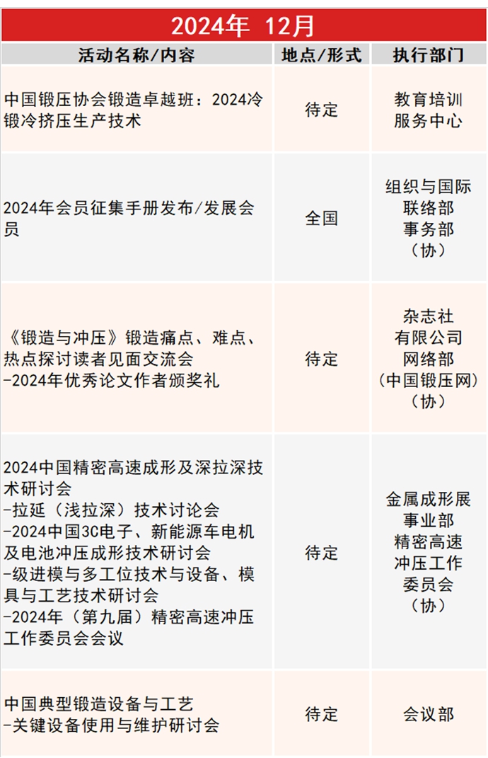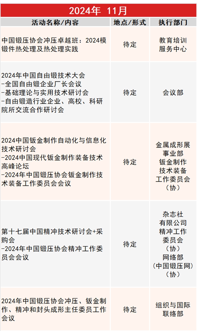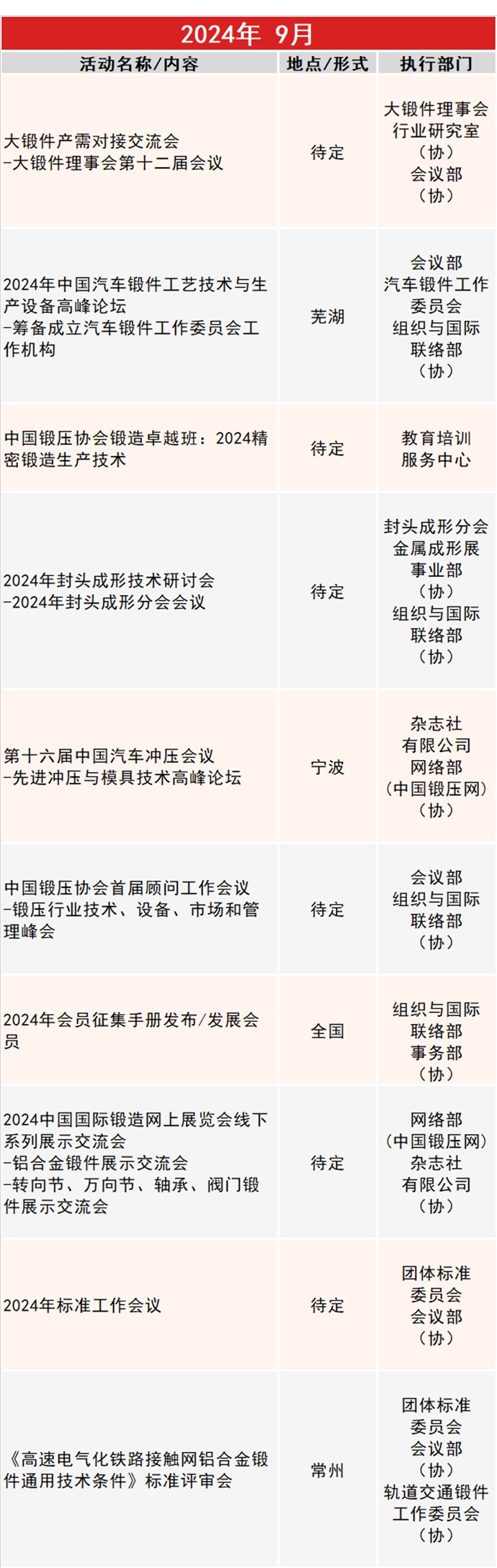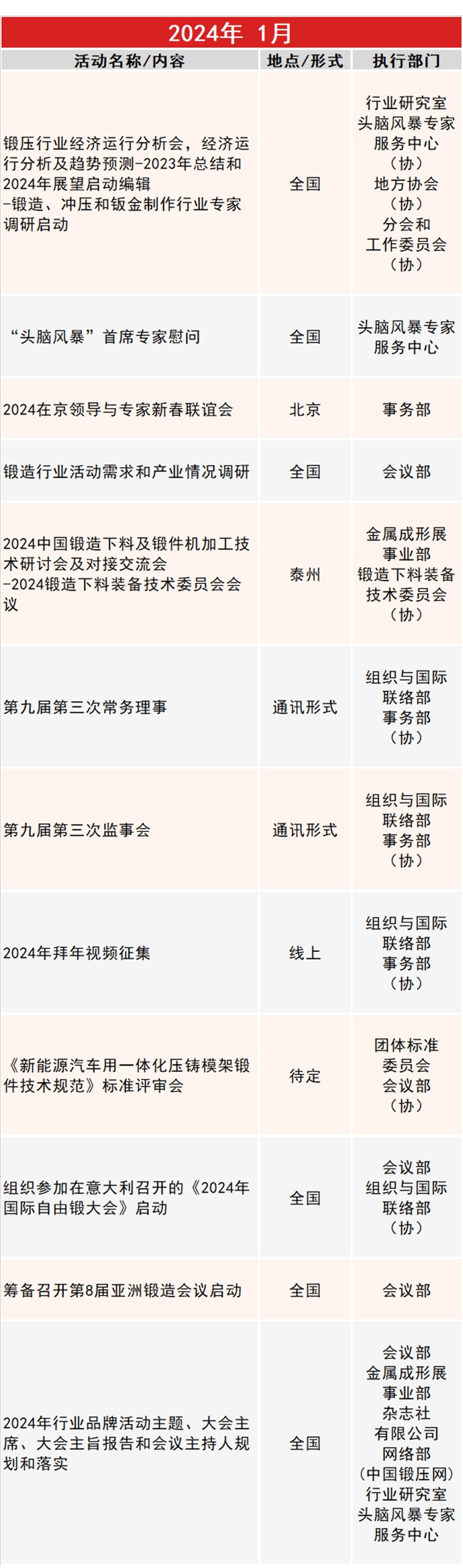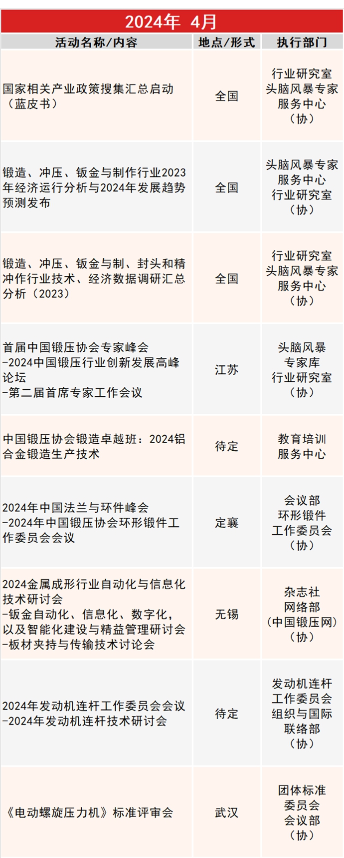(协)=协助之意;富京公司=北京富京技术公司;杂志社有限公司=《锻造与冲压》杂志社有限公司;地方协会=与 建立了联络关系的地方锻造、冲压和钣金制作行业协会;多部门并列一起表示共同组织。 按专业和行业设立有19个分会和工作委员会,一些活动明确了由分会或相应工作委员会承办。对涉及其他分会或工作委员会专业内容的活动,该分会或工作委员会即成为活动的主办方或协办方,但活动表中没有列出这些分会或工作委员会名称,以活动通知为准。