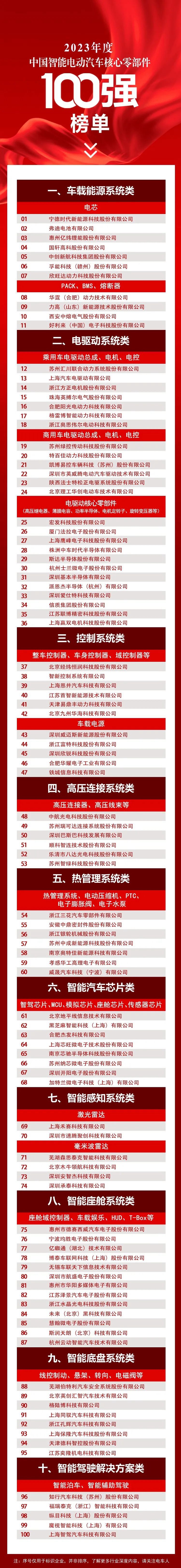日前,电车人发布历时6个月评选的2023年度中国智能电动汽车核心零部件100强名单,涉及10大类、30余个小类、40多个细分领域的优秀产业链企业入选。