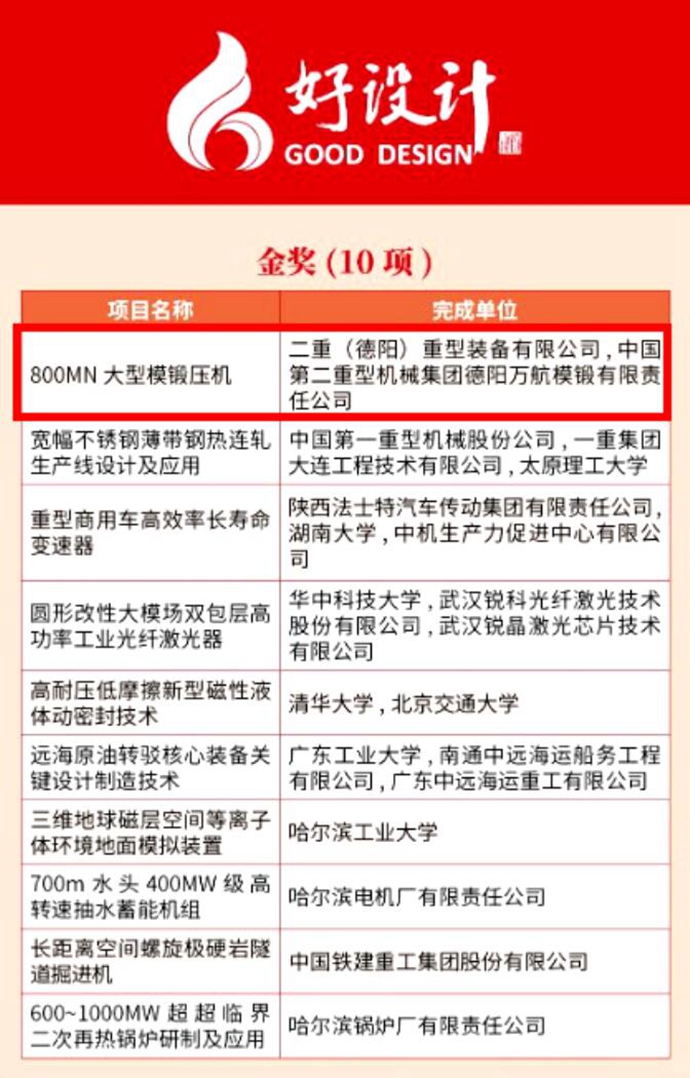 近日,在2023年中国创新设计大会暨2023年度好设计颁奖大会上,国机重装二重装备、中国二重万航模锻联合申报的“800MN大型模锻压机”项目拔得头筹,荣膺2023年中国“好设计”金奖。