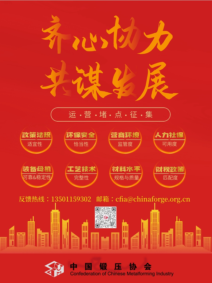 是锻造、冲压、钣金与制作行业的利益代表,是企业与政府之间的桥梁,向政府反映行业和企业诉求。提出有利于行业发展和行业治理的政策建议和意见是协会存在的价值,也是协会的重要工作内容。基于当前国家治理体系的不断完善,环境保护、劳动安全和双碳工作的需要,地方政府依据已有的法律法规对企业进行监督检查。在这个过程中,由于对法律法规条款理解或解读上的差异,以及锻造、冲压、钣金与制作专业生产的特殊性,一定会有一些不符合行业、企业的规定和要求。 希望广大企业基于实事求是的原则,就遇到的问题及时向 反映,以便 开展调研,形成报告,代表行业与国家主管部门沟通,通过主动沟通、解释、解答,争取正确规范锻造、冲压、钣金与制作行业的环保安全生产。倡导行业广大企业放弃对抗或找关系而带来麻烦,甚至于变相推动权力腐败的行为,积极向 反馈企业运行堵点问题,助力锻压行业健康可持续发展。反馈热线:13501159302