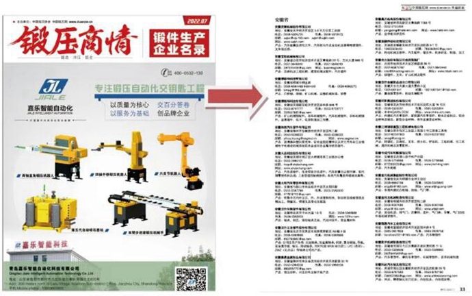 1基本信息收录锻件通讯录公司名称、地址、电话、邮箱、主营产品,将被收录在《锻压商情—锻件生产企业名录》2024年5月特刊企业名录中,在采购洽谈会、展览等相关活动发放、推荐,免费邮寄给锻件采购商,便于采购方精准收集。