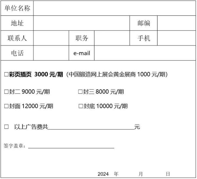 本刊内容以锻造零部件企业名录为主,将精准收集4000家左右锻造厂点信息,是锻造相关企业开拓市场的指导用书,也是采购商查询企业及产品信息的便利指南,预计总发行量在3万册以上。其中刊内可提供企业彩页宣传,是各优秀企业宣传产品的理想途径,欢迎有需要的企业踊跃刊登广告,数量有限,先到先得。