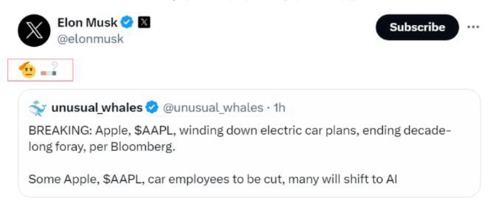 与此同时,面对潜在的竞争对手退出赛道,马斯克在社交平台上发了两个表情,置评苹果取消造车计划。