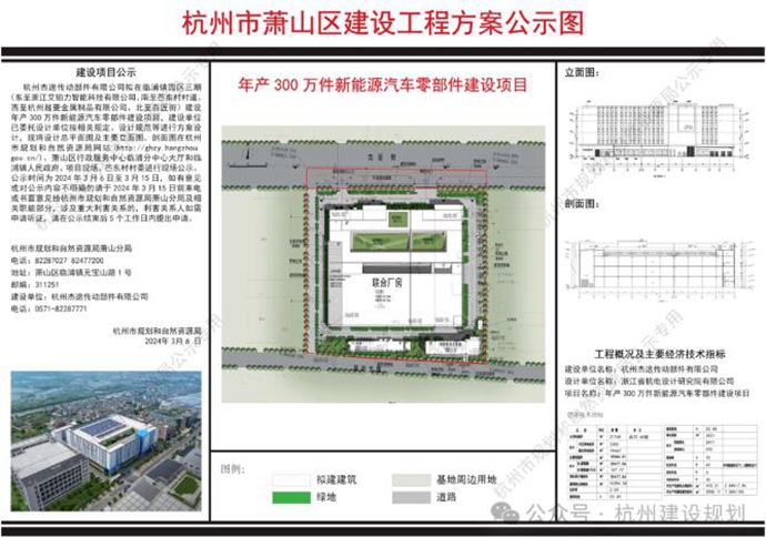 杭州杰途传动部件有限公司拟在临浦镇园区三期建设年产 300 万件新能源汽车零部件建设项目,建设单位已委托设计单位按相关规定、设计规范等进行方案设计,现将设计总平面图及主要立面图、剖面图在杭州市规划和自然资源局网站、萧山区行政服务中心临浦分中心大厅和临浦镇人民政府、项目现场、苎东村村委进行现场公示,公示时间为2024年3月6日至3月15日。