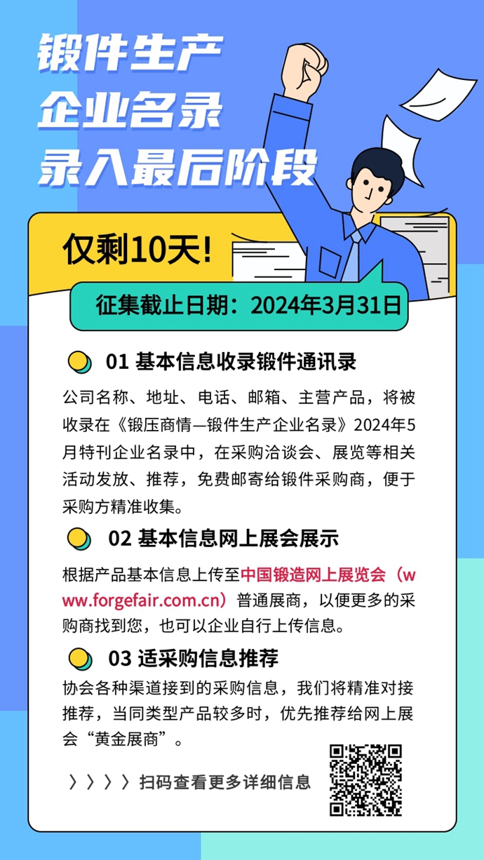 由 主办的 《锻压商情—锻件生产企业名录》2024年开始修订,最新修订版计划于2024年5月出刊。