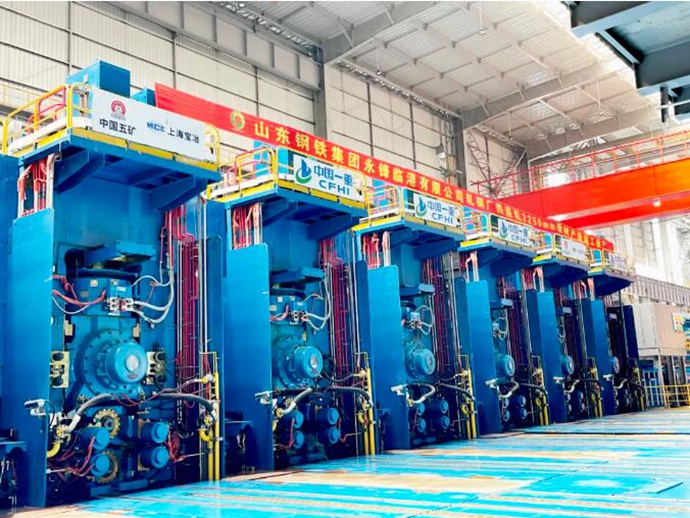 2250mm热连轧生产线是山钢永锋临港有限公司先进优特钢产业基地二期项目,也是中国一重与山钢永锋临港有限公司的首次战略合作,更是中国一重近年来承制的工艺及设备配置最齐全、装机水平最高的高端宽幅带钢热连轧生产线。该项目基于板带热轧生产线全流程智能化工艺设计软件系统,对工艺布置及设备配置进行了全流程优化。生产线采用了最先进的大减宽量定宽压力机技术、节能化分段式粗轧除鳞技术、新一代双工位无芯移送式热卷箱技术、优化剪切曲柄式飞剪技术、三排集管式超高压精除鳞技术、新型精轧机工作辊强力弯辊及横移装置技术、新型牌坊式强力夹送辊技术、可移出式强力卷取机技术等多项自主创新技术,并融合世界先进的自动化与智能化技术,着力打造一条具有典型性和标杆意义的高端热轧生产线,引领国内智慧热轧。