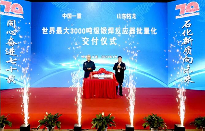 随后,进行世界最大3000吨级锻焊反应器批量化交付仪式,中国一重集团董事长徐鹏、山东裕龙石化董事长程仁策上台揭下红绸。