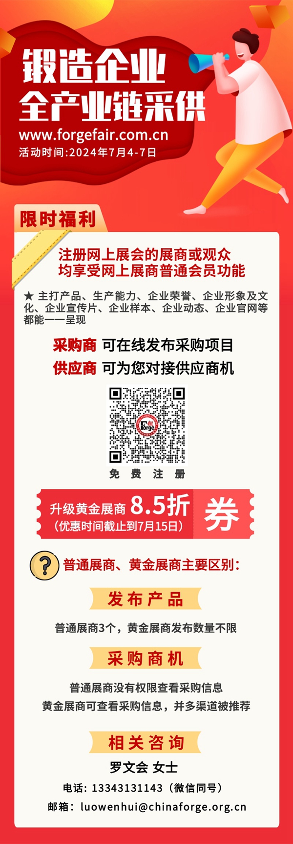 2024年7月4-7日, 将于上海举办2024中国国际金属成形展览会,为更好地促进企业全方位立体化展示和对接,锻造行业全产业链企业采供对接信息平台—— (m.lvnten.com)特推出限时福利!