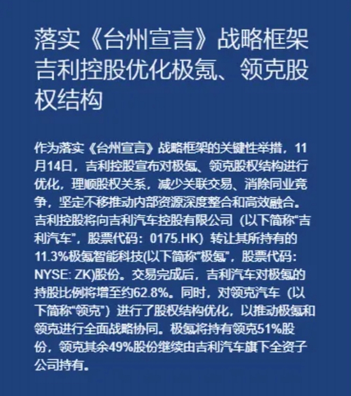 吉利旗下两大品牌极氪与领克正式官宣合并。11月14日,吉利控股集团宣布,作为落实《台州宣言》战略框架的关键性举措,对极氪、领克股权结构进行优化。吉利控股集团将向吉利汽车控股有限公司转让其所持有的11.3%极氪股份。交易完成后,吉利汽车对极氪的持股比例将增至约62.8%。