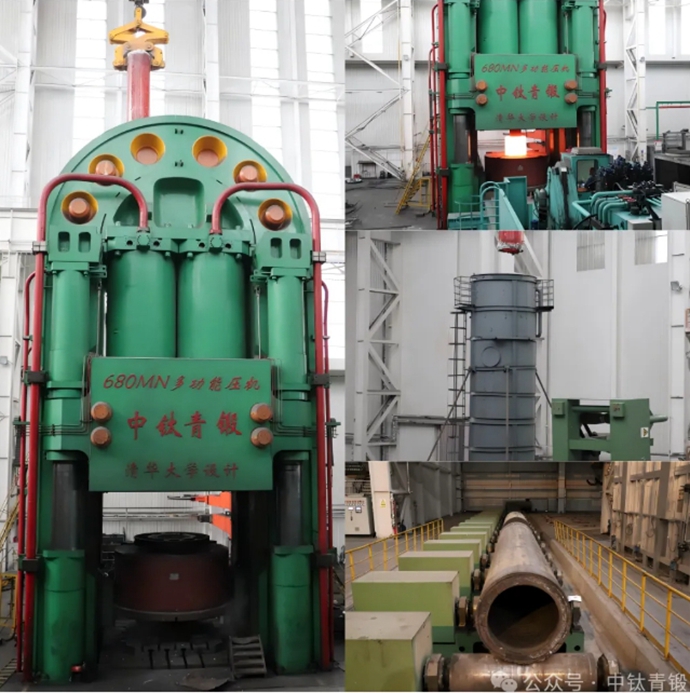 2024年11月12日上午,在中钛青锻 680MN 多功能压机平台上一根红彤彤的超大尺寸316LN不锈钢无缝管材徐徐吊出,然后快速进入冷却水塔中,现场瞬间翻滚出大量的水汽,标志着本次超大口径316LN不锈钢无缝管材试制成功。