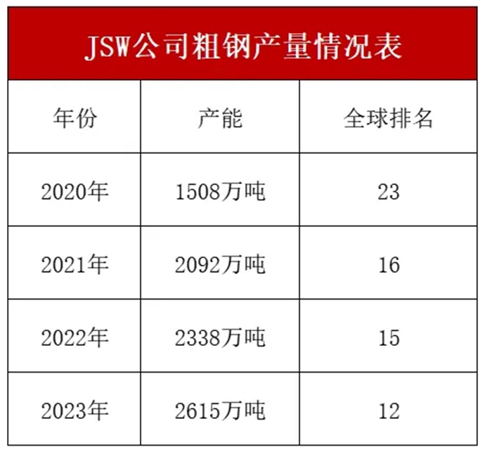 2020年,JSW公司粗钢产量为1508万吨,到2023年,粗钢产量为2615万吨。2023年相比于2020年,JSW公司的粗钢产量增加了1107万吨,其粗钢产量的全球排名从2020年的第23位逐步提升至2023年的第12位。