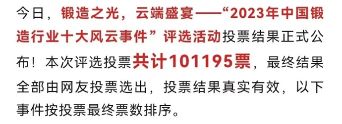 日前,由 (m.lvnten.com)与《锻造与冲压》杂志社主办的“锻造之光,云端盛宴——2024年中国锻造行业十大风云事件评选活动”,已经开启候选事件征集。在此,我们诚挚地邀请您成为冠名赞助商,与我们携手并进,共同记录锻造时代篇章。