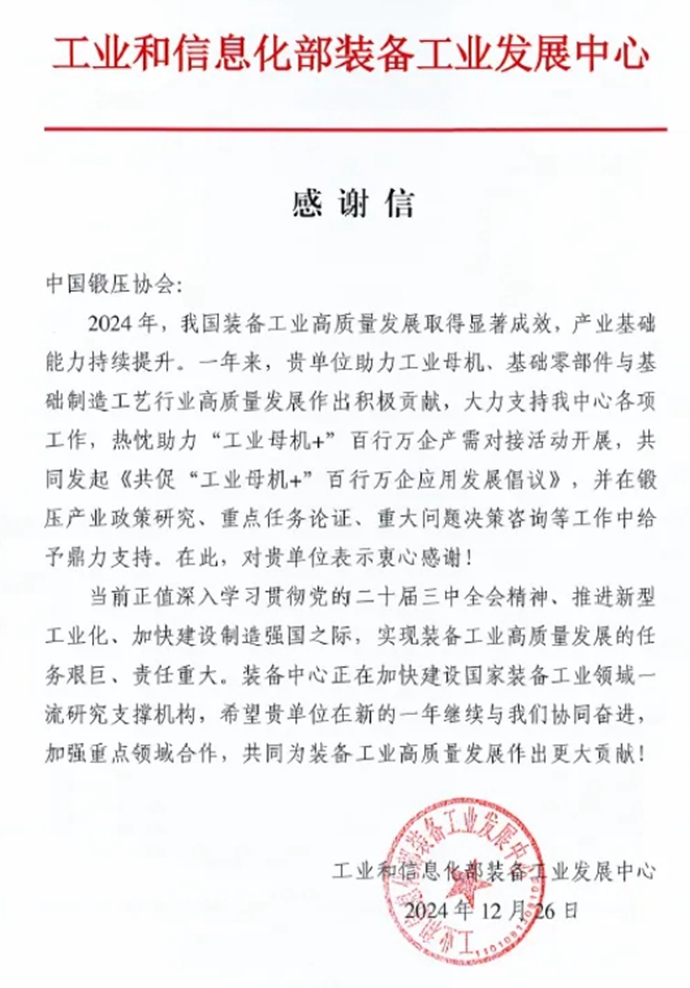 工信部装备工业发展中心向 发来感谢信!
